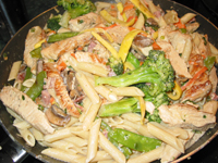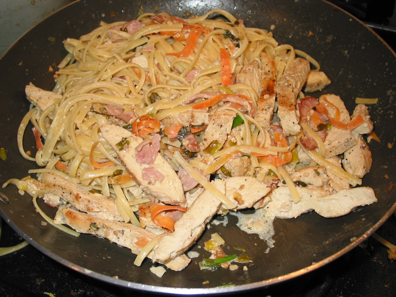 12. When the linguini is done, drain and wash it with hot water. Put about two-thirds of the linguini (that's all you need) back into the pot it was cooked in, and then pour most of the liquid out of the pan over the linguini. This will let you mix it up easily. After mixing, return linguini and sauce to pan with the chicken and mix everything together. Serve when well-heated. Much of the sauce will get absorbed (mmmm luscious).