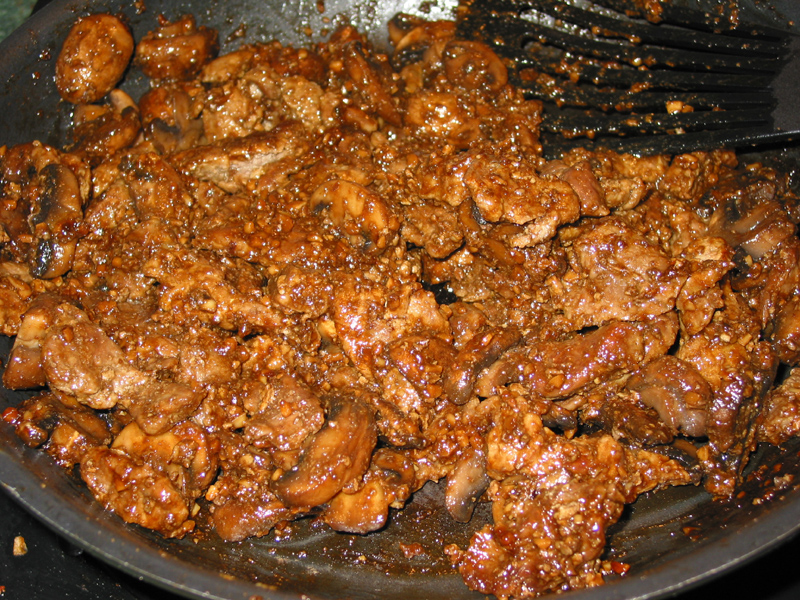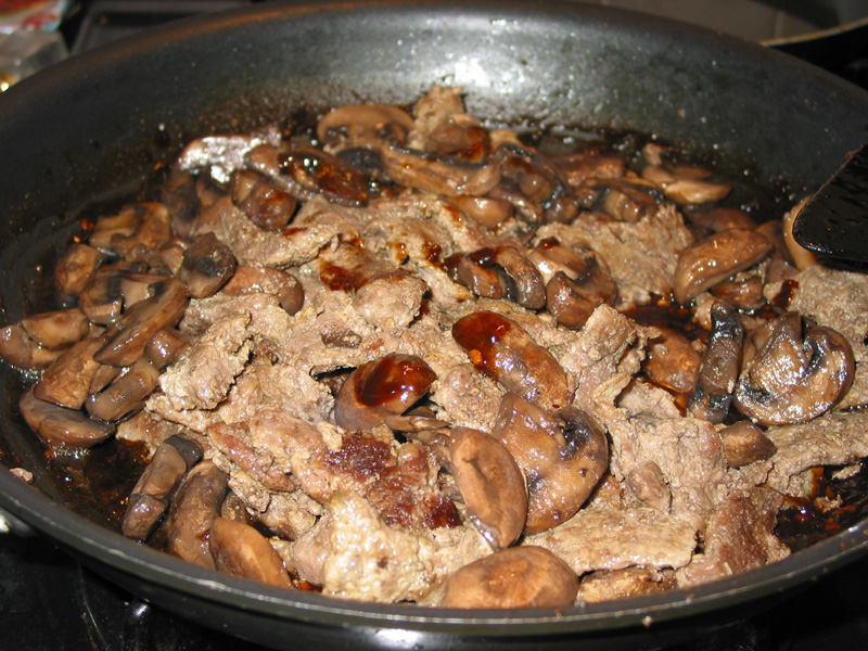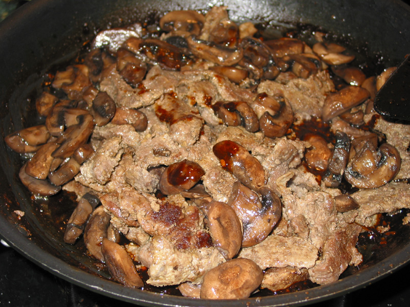 7. Add beef and mushrooms back in, mix thoroughly and heat throughout. Sauce