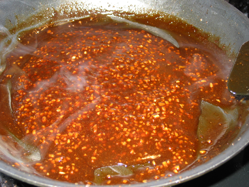 6. After beef is done and removed, add sauce to pan. Cook sauce down, boiling,